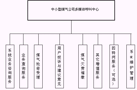 客戶利用電話、手機等撥打某一特服號碼(如9xxxx)進入中小型煤氣公司多媒體呼叫中心系統(tǒng),本系統(tǒng)依托煤氣公司各類業(yè)務技術支持系統(tǒng)和網絡系統(tǒng),通過人工受理或自動語音服務等方式全天24小時不間斷地為客戶提供各種服務。
