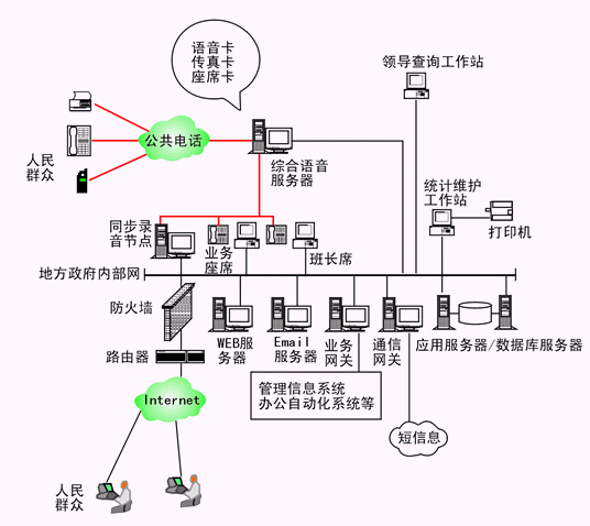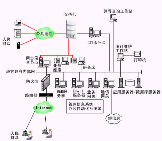 本系統(tǒng)物理結(jié)構(gòu)由帶語音板卡的工控機(jī)或排隊(duì)交換機(jī)、座席分流器、CTI服務(wù)器、IVR(交互式語音應(yīng)答)/IFR(交互式傳真應(yīng)答)服務(wù)器、業(yè)務(wù)代表座席、班長(zhǎng)座席、統(tǒng)計(jì)維護(hù)管理工作站、因特網(wǎng)(WEB)服務(wù)器、電子郵件(EMAIL)服務(wù)器、數(shù)據(jù)庫/應(yīng)用服務(wù)器、業(yè)務(wù)網(wǎng)關(guān)服務(wù)器、錄音留言工作站、領(lǐng)導(dǎo)查詢工作站、網(wǎng)絡(luò)系統(tǒng)等構(gòu)成。