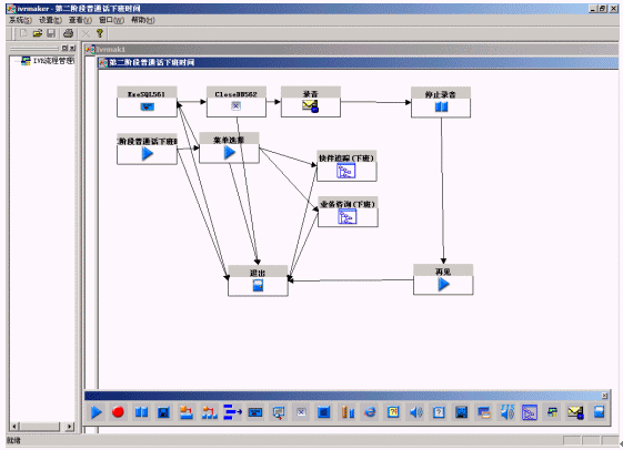 系統(tǒng)提供圖形化的語音流程生成環(huán)境,以方便用戶對語音流層進(jìn)行定制。流程生成器是一套可視化的流程設(shè)計工具,通過拖拉圖標(biāo)控件、鼠標(biāo)連線即實現(xiàn)呼叫中心CTI流程的制作,同時,通過運行時鏈接動態(tài)連接庫(DLL),實現(xiàn)對業(yè)務(wù)數(shù)據(jù)庫的訪問;通過運行時鏈接用戶DLL,最靈活地與用戶應(yīng)用系統(tǒng)結(jié)合;支持多種業(yè)務(wù)集成和動態(tài)流程控制,方便用戶拓展業(yè)務(wù);采用事件驅(qū)動機(jī)制、開放的結(jié)構(gòu),滿足各種語音系統(tǒng)的需要;支持不限個數(shù)、級數(shù)的IVR結(jié)構(gòu),可滿足用戶非常復(fù)雜的需求。