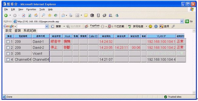 監(jiān)看臺:系統(tǒng)登入后的主畫面,可以監(jiān)控各路電話的當(dāng)前使用情況(包括來電號碼、去電號碼、振鈐次數(shù)、錄音開始時間、錄音結(jié)束時間、線路狀況等信息)。并可以實現(xiàn)對任意通話的網(wǎng)絡(luò)實時監(jiān)聽。