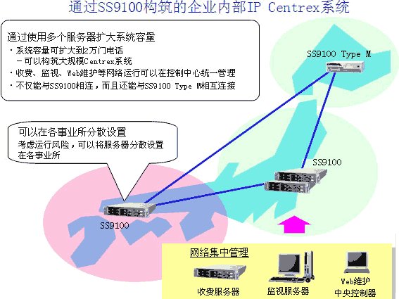 多個SS9100服務(wù)器相互協(xié)作,擴大了系統(tǒng)整體容量。以往模型由1個服務(wù)器構(gòu)成,系統(tǒng)最大只能容納5千門電話,而SS9100 R5可以構(gòu)筑將系統(tǒng)整體容量擴展到容納2萬門電話的大規(guī)模Centrex系統(tǒng)。進(jìn)而,通過將服務(wù)器分散設(shè)置在各事業(yè)所的形式,可以考慮分散各事業(yè)所之間故障危險的基礎(chǔ)上構(gòu)筑系統(tǒng)。