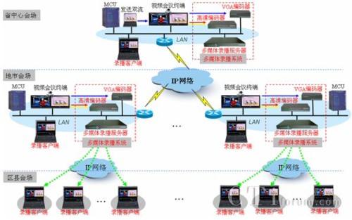 項(xiàng)目中采用了17套銳取高清錄播系統(tǒng),分別部署省國稅及下轄16個(gè)州、市國稅。銳取高清錄播系統(tǒng)采用分布式產(chǎn)品架構(gòu),由多媒體錄播服務(wù)器和前端的編碼器組成。多媒體錄播服務(wù)器部署在網(wǎng)絡(luò)機(jī)房;高清編碼器和VGA編碼器分別部署在高清視頻會(huì)議室,編碼器從華為高清視頻會(huì)議終端獲取視音頻及雙流信號,并通過IP網(wǎng)絡(luò)發(fā)送給機(jī)房內(nèi)多媒體錄播服務(wù)器,由多媒體錄播服務(wù)器實(shí)現(xiàn)視頻會(huì)議的錄制、直播和點(diǎn)播。分會(huì)場及不具備視頻會(huì)議終端的地方,可使用電腦登陸多媒體錄播服務(wù)器來接收會(huì)議的實(shí)時(shí)直播或在會(huì)后進(jìn)行點(diǎn)播。