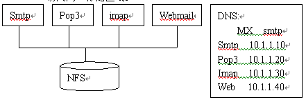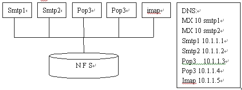 郵件服務(wù)器smtp、pop3、imap、webmail服務(wù)分布在不同的服務(wù)器上,通過NFS統(tǒng)一訪問同一存儲(chǔ)區(qū)域。