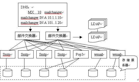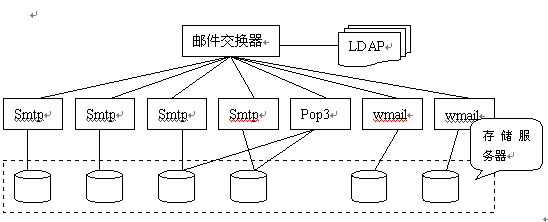 該系統(tǒng)前端(front-end)是一個(gè)郵件交換器和目錄服務(wù)器LDAP,后端是多臺(tái)獨(dú)立的存儲(chǔ)服務(wù)器,通過管理中心調(diào)度,將存儲(chǔ)服務(wù)器通過NFS掛在相應(yīng)的smtp服務(wù)器或者pop服務(wù)上。