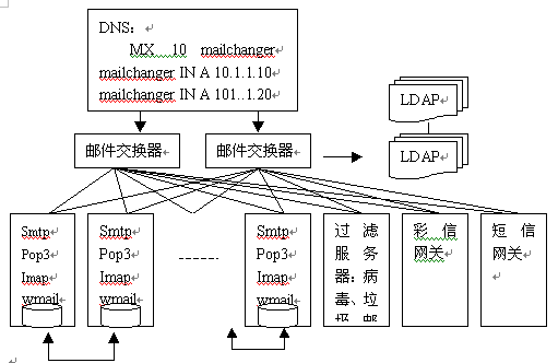 這種方案將以郵件服務(wù)器為單位,形成郵件服務(wù)器陣列。每臺(tái)郵件服務(wù)器具有完整的郵件服務(wù)功能:smtp/pop3/imap/webmail等。用戶認(rèn)證信息集中存放于LDAP服務(wù)器,通過LDAP查找用戶所在郵件服務(wù)器。