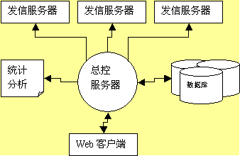 1. 以總控服務(wù)器為控制中心,控制一臺(tái)或多臺(tái)郵件發(fā)送服務(wù)器,每臺(tái)發(fā)送服務(wù)器管理一個(gè)或多個(gè)郵件隊(duì)列?刂浦行目刂凄]件列表,任務(wù)列表、作業(yè)列表,并與業(yè)務(wù)數(shù)據(jù)庫(kù)通過(guò)數(shù)據(jù)庫(kù)接口連接,根據(jù)條件提取數(shù)據(jù),更新郵件發(fā)送列表,生成統(tǒng)計(jì)分析報(bào)告。