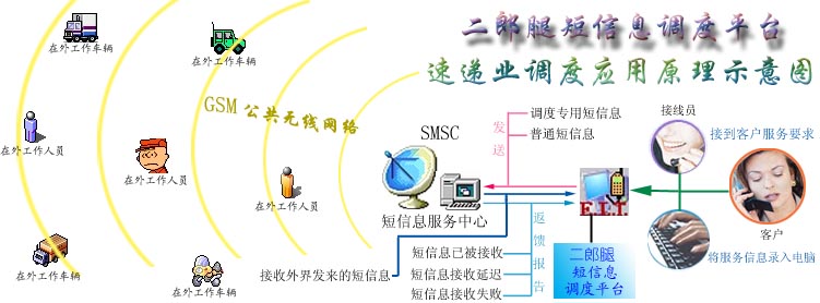 二郎腿短信息調度平臺是利用目前社會上大眾普遍擁有手機的現(xiàn)成資源,通過移動通訊公司提供的短信息服務功能作為通信信道,直接對手機進行低層操作控制,以“收發(fā)短信息”的方式來實現(xiàn)信息的傳遞(通信資費標準與在手機上收發(fā)短信相同)。調度平臺還對每條發(fā)出的信息的接收狀態(tài)進行跟蹤,確保信息能被安全 、準確的接收。“調度專用短信息”遵循專為各種調度工作而設計的《調度協(xié)議》,遵循該協(xié)議能最大限度避免由于“短信息服務中心”的失誤,而導致短信息丟失的情況。調度專用短信息對“接收設備”無特殊要求,任何支持“接收中文短信息”的手機都能實現(xiàn)。