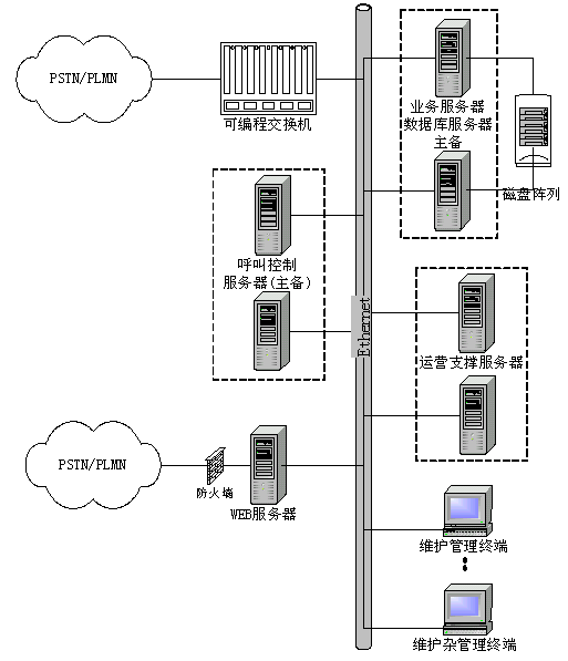 數(shù)據(jù)庫服務(wù)器是系統(tǒng)的系統(tǒng)數(shù)據(jù)和呼叫記錄(CDR)的數(shù)據(jù)儲存單元,支持SQL Server 2000、Oracle、Sybase等通用關(guān)系數(shù)據(jù)庫。用戶數(shù)據(jù)備份可提供數(shù)據(jù)庫自身備份方式、數(shù)據(jù)庫熱備份冗余方式。