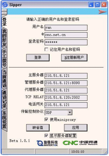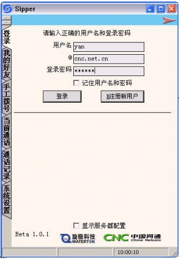 在主界面上選擇"注冊新用戶",這時會出現(xiàn)網(wǎng)通的注冊界面,選擇"開始注冊",然后將各項用戶信息填寫清楚后,創(chuàng)建用戶,成功后即可回到sipper界面登陸。