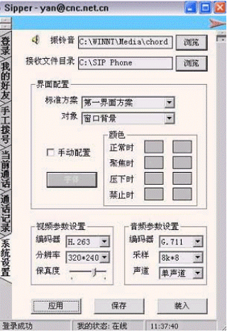 在該窗口中可以對系統(tǒng)的各項參數(shù)進行設(shè)置:振玲音、接受文件目錄、界面配色方案、大小視頻等。