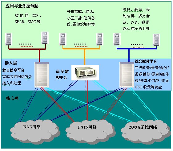 2)、在同一平臺融合支持多種電信網(wǎng)絡(luò)技術(shù)規(guī)范,包括2G/3G/NGN的信令、交換、多媒體處理功能,為現(xiàn)在與將來的電信增值業(yè)務(wù)提供了值得長期合作的基礎(chǔ)平臺;
