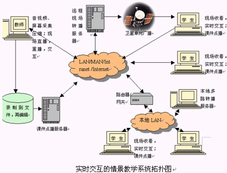 實(shí)時(shí)交互的情景教學(xué)系統(tǒng)是一整套提供實(shí)時(shí)的遠(yuǎn)程教學(xué)服務(wù)的系統(tǒng)軟件,它采用音視頻交互系統(tǒng)、文件共享交互系統(tǒng)、電子白板、BBS系統(tǒng)等多種系統(tǒng)的整合,為教師與學(xué)生提供了方便、適用交流工具。實(shí)時(shí)交互的情景教學(xué)系統(tǒng)不僅是先進(jìn)的計(jì)算機(jī)科學(xué)和技術(shù)體現(xiàn),更重要的是能夠?yàn)檫h(yuǎn)程教育提供一個(gè)符合信息化教育規(guī)律,真正高效的現(xiàn)代化教學(xué)手段。