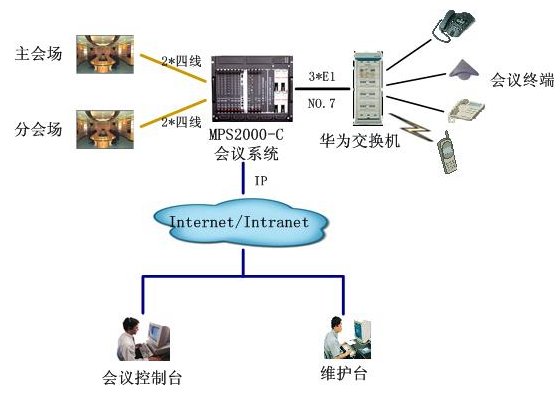 該會議系統(tǒng)通過3個數字中繼,與華為用戶交換機互連,通信采用NO.7信令。4路4線中2路接主會場調音臺,2路分會場調音臺,實現(xiàn)會議室擴音設備的接入。通過以太網口與D-LINK網絡交換機互連,接入廊坊電力的局域網,實現(xiàn)維護管理及會議控制等功能。