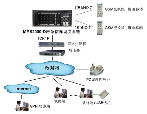 從上示組網(wǎng)圖中可以看到,整套MPS2000-D應(yīng)急指揮調(diào)度系統(tǒng)利用了移動網(wǎng)管中心的數(shù)據(jù)網(wǎng)絡(luò)資源,通過SIP協(xié)議,在各個PC終端上通過軟終端的方式接入調(diào)度系統(tǒng),作為IP調(diào)度終端。平時可將該軟終端作為個人通訊助理終端,解決用戶的多種通信需求。并通過PC調(diào)度臺來對整套系統(tǒng)進(jìn)行應(yīng)急調(diào)度控制。