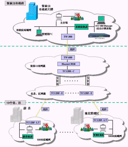 張家口市地處河北省與內(nèi)蒙古交界處,地域廣闊,如何實(shí)現(xiàn)方便、及時(shí)、快捷的溝通一直困擾著市政府。其下設(shè)的19個(gè)區(qū)縣的線(xiàn)路質(zhì)量參差不齊,整個(gè)網(wǎng)絡(luò)環(huán)境非常復(fù)雜。經(jīng)過(guò)一系列的商討,張家口政府成為了聯(lián)通公司第一位簽約用戶(hù)。