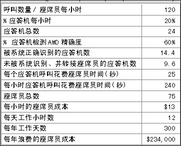 表1和表2表明在一個(gè)呼叫中心中精確的應(yīng)答機(jī)檢測(AMD)給企業(yè)所帶來的價(jià)值,兩表之間關(guān)于呼叫中心運(yùn)營的費(fèi)用每年相差$175,500。那么不同的AMD精確度意味著什么?在上例中,精確度每增加1%意味著每年會減少約$5,850的損失。