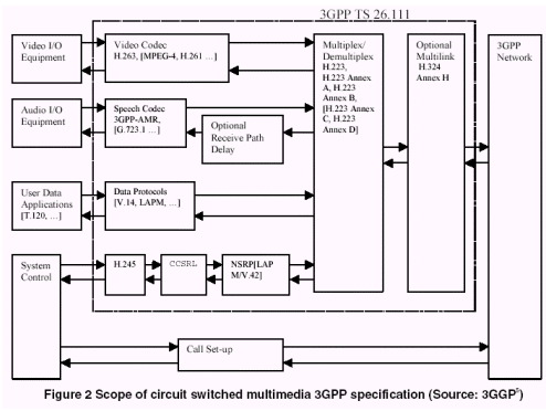 3G網(wǎng)絡(luò)上用于視頻通訊的3GPP標(biāo)準(zhǔn)定義了使用于視頻消息傳送(參看3.3部分)和視頻呼叫的視頻解碼器。在交換線路上實(shí)行64kbps速率的實(shí)時呼叫時,H.263是推薦標(biāo)準(zhǔn),如圖2所示。可選的其他視頻解碼器中,MPEG-4和H.261不是標(biāo)準(zhǔn)所要求的,但可作為可能的候選標(biāo)準(zhǔn)。