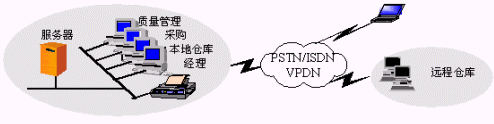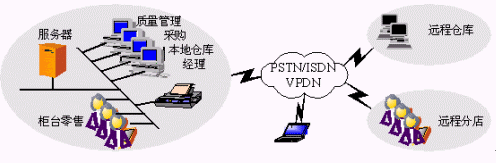 支持遠(yuǎn)程庫(kù)房、遠(yuǎn)程分店以及移動(dòng)辦公。網(wǎng)絡(luò)拓?fù)浣Y(jié)構(gòu)與連鎖經(jīng)營(yíng)企業(yè)基本相同。