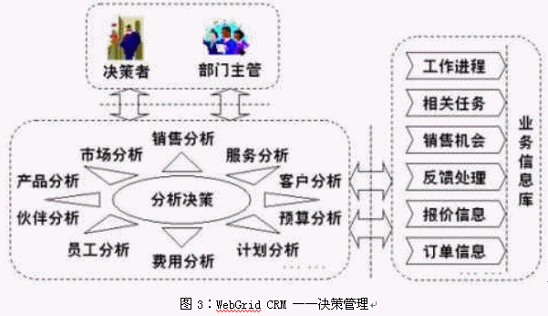 WebGrid CRM是基于CRM理念而設(shè)計的,它將面向客戶的所有業(yè)務(wù)進(jìn)行整合,提供了統(tǒng)一的業(yè)務(wù)平臺,并使用工作流技術(shù)將各種業(yè)務(wù)緊密聯(lián)系起來。WebGrid CRM 的功能可以歸納為三個方面:1) 對銷售、營銷和客戶服務(wù)三部分業(yè)務(wù)流程的信息化;2) 與客戶進(jìn)行溝通所需要的手段(如電話、傳真、網(wǎng)絡(luò)、Email等)的集成和自動化處理;3) 對上面兩部分功能所積累下的信息進(jìn)行的加工處理,產(chǎn)生客戶智能,為企業(yè)的戰(zhàn)略戰(zhàn)術(shù)的決策作支持。見下圖所示: