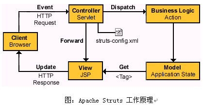 WebGrid CRM在技術(shù)實現(xiàn)上采用Sun公司的標(biāo)準(zhǔn)的MVC(Model-View-Controller)三層體系進(jìn)行架構(gòu),主要通過在Apache公司開發(fā)的Struts Framework的基礎(chǔ)上進(jìn)行應(yīng)用擴(kuò)展,參見下圖結(jié)構(gòu):