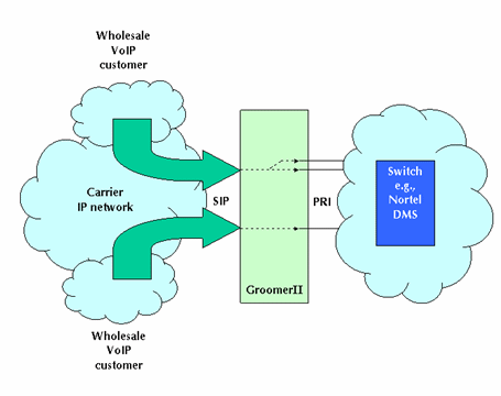 圖1中的GroomerII支持PRI協(xié)議,如:NI-2、ETS300和INS1500等,可以實現(xiàn)網(wǎng)關(guān)的功能把運營商自己的電路交換網(wǎng)和IP網(wǎng)絡(luò)相互連接在一起。這種設(shè)置允許網(wǎng)絡(luò)運營商向其他業(yè)務供應商提供批量VoIP業(yè)務。這類業(yè)務運營商據(jù)此可以向他們的客戶提供具有區(qū)分性的業(yè)務,如:利用SIP電話呼叫等。