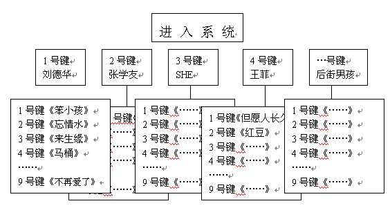 眾所周知,目前大多數(shù)電話(huà)機(jī)和手機(jī)的操作鍵盤(pán)都只有0-9十個(gè)數(shù)字鍵和*號(hào)和#號(hào)兩個(gè)符號(hào)鍵,因此在設(shè)計(jì)導(dǎo)航菜單的時(shí)候很受限制。比如在點(diǎn)歌節(jié)目中,用這些數(shù)字鍵來(lái)指代上千首歌曲是根本不可能的。以前多采用的方法有兩種:一是預(yù)先給用戶(hù)發(fā)送歌曲手冊(cè),上面可以查到每首歌曲的代號(hào)。這種方式的缺點(diǎn)是實(shí)時(shí)性差,不能隨時(shí)更新歌曲庫(kù)。另外印刷宣傳資料帶來(lái)的人力和成本也不容忽視;另一種方法是將歌曲根據(jù)歌手、主題進(jìn)行分類(lèi),比如下圖所列的結(jié)構(gòu):