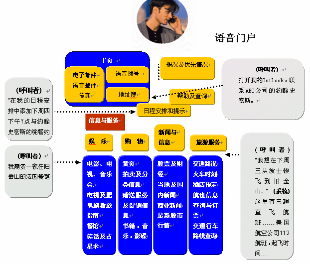 基于在語(yǔ)音識(shí)別技術(shù)準(zhǔn)確度上已有突破性的進(jìn)展,因此可以利用語(yǔ)音,不僅僅是改變?cè)械逆I盤(pán)輸入查詢(xún)方式,而且能夠使自動(dòng)應(yīng)答系統(tǒng)處理更加復(fù)雜的情況。用戶(hù)撥打服務(wù)電話(huà)的時(shí)候,只需說(shuō)出他/她的需求即可。如在電子黃頁(yè)業(yè)務(wù)中,用戶(hù)要查詢(xún)關(guān)于A公司的情況,服務(wù)電話(huà)接通以后就可以直接說(shuō)出"A公司",而不要按鍵通過(guò)一層層的菜單目錄,然后系統(tǒng)就能自動(dòng)播報(bào)出該單位介紹信息和聯(lián)系方式等。
