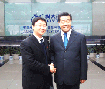 12月19日上午,中共中央政治局常委、全國政協(xié)主席賈慶林一行在安徽省委書記郭金龍、省長王金山等省市領導陪同下來到國家863計劃成果產(chǎn)業(yè)化基地——科大訊飛公司視察,賈慶林主席對科大訊飛在中文語音技術(shù)和產(chǎn)業(yè)化方面的成績給予充分肯定。上午8時30分,賈主席一行抵達訊飛語音產(chǎn)業(yè)大樓。中國科技大學黨委書記郭傳杰、科大訊飛總裁劉慶峰博士、基地總工陳濤及基地工作人員熱烈歡迎賈主席的到來。