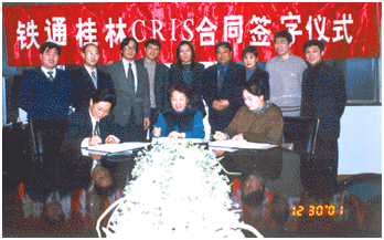 桂林CRIS項(xiàng)目經(jīng)過多方面的努力,2001年12月30日在中鐵網(wǎng)絡(luò)公司,舉行了由中鐵網(wǎng)絡(luò)公司、北京佳訊飛鴻信息技術(shù)有限公司和桂林訊聯(lián)科技有限公司三方代表參加的鐵通桂林CRIS項(xiàng)目合同簽約儀式。