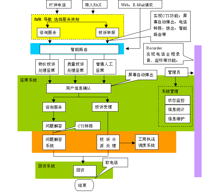 黎明網(wǎng)絡深入研究世界上最新的CTI技術(shù)的發(fā)展和應用,自主研發(fā)推出的12315消費者投訴受理系統(tǒng)采用當前主流的一體化的呼叫中心模式。一體化的呼叫中心模式具有投資少、易于實施、維護工作量較小、維護成本低的優(yōu)點。該系統(tǒng)建立在內(nèi)部以太網(wǎng)基礎上,不同網(wǎng)絡(PSTN網(wǎng)、IP網(wǎng)、GSM/GPRS/CDMA網(wǎng))的消費者可以通過多種方式(電話、傳真、E-mail、短消息等)接入12315系統(tǒng),利用系統(tǒng)提供的服務進行投訴舉報或咨詢。