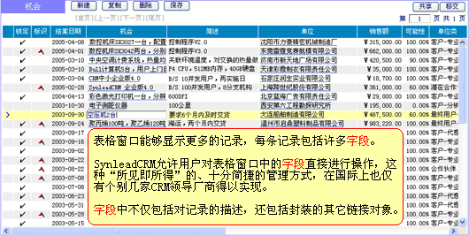 上圖"機(jī)會(huì)管理"表格窗口進(jìn)一步對人本化的管理方法進(jìn)行了舉例。在這里,您可直接對瀏覽到的字段進(jìn)行交互(是否能夠新建、修改、刪除,受管理授權(quán)或默認(rèn)授權(quán)約束),而不必一定要轉(zhuǎn)到另外的窗口才可操作字段。該方法在SynleadCRM中處處存在,它不僅僅為了提高工作效率,更讓企業(yè)在推行CRM管理變革時(shí)襯托出靈活性,而不是帶來了僵化。