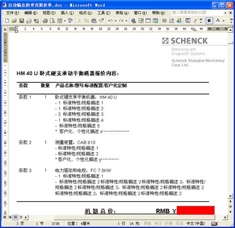以上海申克的報(bào)價(jià)單為例。與其說(shuō)它是一份報(bào)價(jià)單,不如說(shuō)它是一套幾十頁(yè)的客戶化復(fù)雜方案書,它由各方面數(shù)據(jù)和文檔自動(dòng)合并、輸出為一份Word文件: