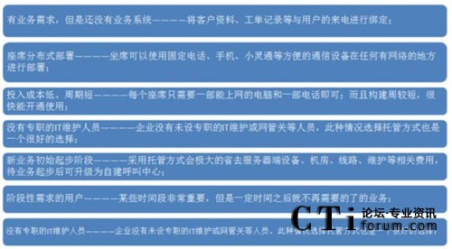 基于云計(jì)算(400+Saas)的ToneThink強(qiáng)訊托管型呼叫中心采用世界最先進(jìn)的呼叫中心核心技術(shù),企業(yè)無(wú)需投入任何軟件、硬件,即可根據(jù)業(yè)務(wù)需求立刻擁有一套自己的呼叫中心系統(tǒng),獲得呼入式、呼出式營(yíng)銷(xiāo)服務(wù)帶來(lái)的超值回報(bào)。那么什么情況下您適合選用托管型的呼叫中心呢?