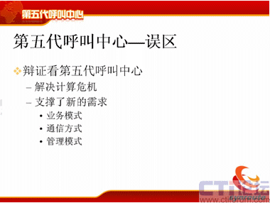 下面我提第五代呼叫中心的誤區(qū),首先我們要辯證地看第五代呼叫中心,剛才好像我在解決問(wèn)題,這個(gè)呼叫中心的計(jì)算危機(jī)產(chǎn)生了,我在解決計(jì)算危機(jī)的問(wèn)題,但是大家要反著想,我把這個(gè)問(wèn)題解決了,我按這種方式去架構(gòu)了,這時(shí)候它的業(yè)務(wù)模式就能支持到非常豐富了,而以前的業(yè)務(wù)模式,業(yè)務(wù)的創(chuàng)造為什么進(jìn)行不下去?我們不能說(shuō)全部都是因?yàn)镮T系統(tǒng),但是IT系統(tǒng)占很大的一個(gè)部分,其實(shí)就是因?yàn)橥顿Y的部分,如果你有足夠錢的話,可以實(shí)現(xiàn)足夠的想法。第二個(gè)方面通信方式也是一樣,通信方式也是你可以支持更多的通信方式,你可以將3G的視頻加上去,你可以將很多業(yè)務(wù)加進(jìn)去,你可以把固定點(diǎn)報(bào)警加上去,你可以把IPTV的業(yè)務(wù)方式加上去,管理模式也一樣,你可以不斷地調(diào)整,這個(gè)調(diào)整只要是在框架一定范圍內(nèi)不斷地調(diào)整都可以支持,那么對(duì)于運(yùn)營(yíng)管理也能同樣進(jìn)行有效的支持。
