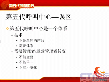 第二個(gè)誤區(qū)也很明顯,第五代呼叫中心其實(shí)是一個(gè)體系,技術(shù)不是一個(gè)單純的產(chǎn)品,你們的這個(gè)錄音支持不支持、是不是第五代呼叫中心的錄音呢?不是這樣的,它是需要一個(gè)體系的。剛才我列出來(lái)的這些,不管你是做知識(shí)庫(kù)的,你是做CRM的,你是做供應(yīng)鏈的,你只要和呼叫中心沾邊,你需要按SOA體系去架構(gòu),否則大家就無(wú)法對(duì)接,你沒(méi)有接口,大家無(wú)法相互連接。這里面我重點(diǎn)提一下中間件的概念,它對(duì)于SOA和實(shí)時(shí)服務(wù)總線要求是非常高的,因?yàn)橹虚g件是要直接和交換機(jī)進(jìn)行連接通信的,電話的反應(yīng)是直接要反應(yīng)在中間件上的,這個(gè)數(shù)據(jù)是要求實(shí)時(shí)性最高的一個(gè)部分,這里面包括客戶資料管理,包括IVR這個(gè)東西都是需要這樣一個(gè)體系來(lái)支撐的。