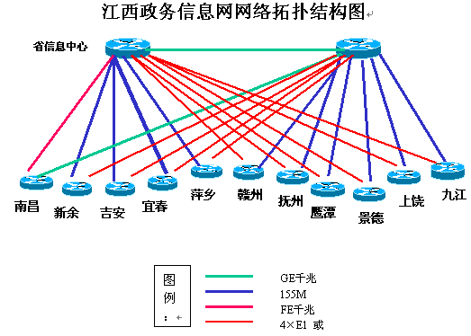 江西省于2002年8月開始實(shí)施省政務(wù)信息網(wǎng)縱向網(wǎng)省市聯(lián)網(wǎng)工程,于2002年12月底實(shí)施完畢。目前,在南昌地區(qū)已建成省級政務(wù)核心網(wǎng)及政務(wù)專網(wǎng),省委、省政府、省人大、省政協(xié)及一百多個(gè)省直部門,已通過光纜實(shí)現(xiàn)了橫向網(wǎng)絡(luò)互聯(lián)。