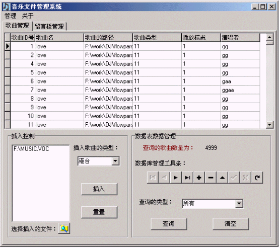 本軟件專門設計用來管理彩話系統(tǒng)中的音樂文件?捎迷撥浖M行歌曲的管理,包括插入,查詢,修改,刪除等操作。