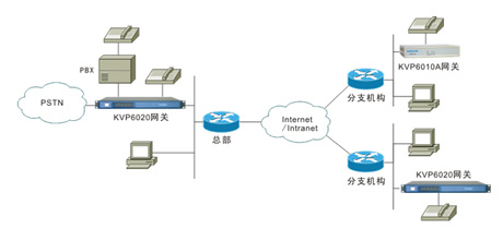 KVP6020采用模塊化設(shè)計(jì),支持FXS、FXO、E&M、E1等多種語音模塊,最大可支持40路FXS用戶接口,可用于總部和大、中型分支機(jī)構(gòu),提供IP語音通信業(yè)務(wù),也可通過FXO、E&M、E1等中繼接口與PBX、與PSTN相連,提供中繼匯接業(yè)務(wù),典型應(yīng)用如下圖。