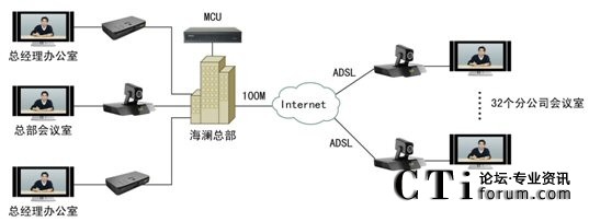 2009年6月,領(lǐng)先的視訊廠商科達攜TrueSens(致勝)視頻會議系統(tǒng)走進海瀾,為海瀾集團搭建了一套覆蓋總部2個領(lǐng)導(dǎo)辦公室、1個銷售會議室及全國32個分公司的視頻會議系統(tǒng)。整個方案在部署上非常便捷,海瀾江陰總部的機房架設(shè)一臺高、標清一體化多點控制單元(MCU),銷售會議室、集團王總、陶總的辦公室以及海瀾集團在全國的32個分公司銷售會議室則各部署一套視頻會議終端?偛繋挒100M,分支機構(gòu)則均通過普通ADSL接入。系統(tǒng)拓撲圖如下: