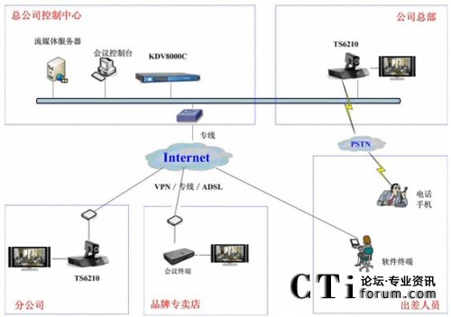 科達(dá)TrueSens視頻會(huì)議系統(tǒng)最大的特點(diǎn)就是擁有超強(qiáng)的網(wǎng)絡(luò)適應(yīng)性。由于采用了高效視音頻編碼技術(shù)和大量智能化網(wǎng)絡(luò)適應(yīng)技術(shù),無(wú)論是ADSL、光纖還是VPN,均可進(jìn)行快速接入,并充分保證在Internet環(huán)境下的會(huì)議效果。勁霸此次視頻會(huì)議系統(tǒng)就是基于Internet進(jìn)行部署的。如圖1。