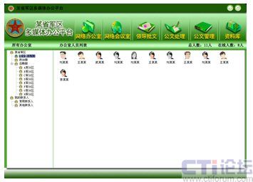 如圖所示的畫面即為網(wǎng)動協(xié)同辦公系統(tǒng)的基礎(chǔ)工具——協(xié)同通訊系統(tǒng),該系統(tǒng)可將部隊(duì)機(jī)構(gòu)內(nèi)的所有部門、人員按照實(shí)際的組織結(jié)構(gòu)列出,應(yīng)用該系統(tǒng)的人員通過點(diǎn)擊其他在線人員,從而有選擇性的與對方進(jìn)行語音、視頻、數(shù)據(jù)共享、點(diǎn)對點(diǎn)會議等各種操作,將以往“看不見”的對話變?yōu)椤懊鎸γ妗钡慕涣。相比于傳統(tǒng)的電話溝通而言,它不僅更暢通快捷,更可以最大化的降低溝通成本。另外,數(shù)據(jù)共享功能還可以將軍隊(duì)里需共同探討的話題,如作戰(zhàn)地圖動態(tài)研究、工作報告資料等實(shí)時顯示在數(shù)據(jù)區(qū)中,雙方通過電腦即可進(jìn)行遠(yuǎn)程的話題討論、圈點(diǎn)批注。