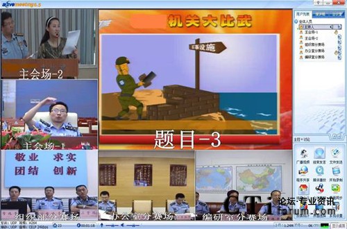 本次架設(shè)的空軍大比武平臺(tái),滿足了總部主持指揮協(xié)調(diào)和各二級(jí)部參加比賽的應(yīng)用。總部與各二級(jí)部分別架設(shè)網(wǎng)動(dòng)視頻會(huì)議硬件終端,分會(huì)場觀眾通過登錄網(wǎng)動(dòng)統(tǒng)一通信平臺(tái)Active UC®觀看實(shí)時(shí)比賽畫面,并與現(xiàn)場互動(dòng)、點(diǎn)評(píng)?偛恐鞒秩丝晒蚕韰①惒块T的答題桌面,把答題結(jié)果展現(xiàn)給評(píng)委和各會(huì)場觀眾。系統(tǒng)可實(shí)現(xiàn)舉手搶答,答題結(jié)果實(shí)時(shí)上傳等貼心功能。
