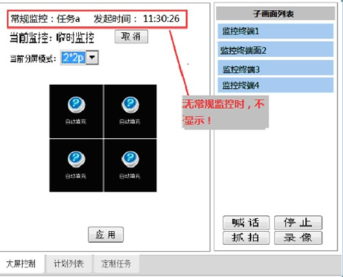 監(jiān)控計(jì)劃規(guī)定了監(jiān)控系統(tǒng)何時(shí)以何種方式在大屏上顯示多個(gè)現(xiàn)場(chǎng)的監(jiān)控畫(huà)面。監(jiān)控畫(huà)面可輪詢,可調(diào)整設(shè)置畫(huà)面分屏顯示模式;可以固定在某位置顯示某監(jiān)控畫(huà)面;可以切換到險(xiǎn)情聯(lián)動(dòng)監(jiān)控模式。可以與監(jiān)控畫(huà)面喊話;監(jiān)控錄像;保存畫(huà)面等功能。