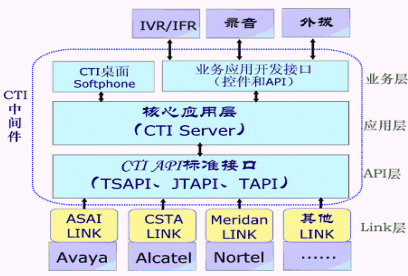CTI中間件用來在計算機應用系統(tǒng)和交換設備之間充當接口作用,起著承上啟下的作用;CT中間件向下提供通用性支持(對主要交換機消息接口和符合CSTA標準的交換設備的支持);向上提供應用接口或開發(fā)控件,包括呼叫控制、座席管理以及其他設備接口等功能,這些是CT中間件的核心功能。但目前CTI中間件已經(jīng)拓寬了該應用范圍,CTI中間件還向上延伸了功能,提供了一部分業(yè)務應用和業(yè)務管理功能,如業(yè)務系統(tǒng)、監(jiān)控系統(tǒng)、計費系統(tǒng)、呼叫統(tǒng)計報表的應用。
