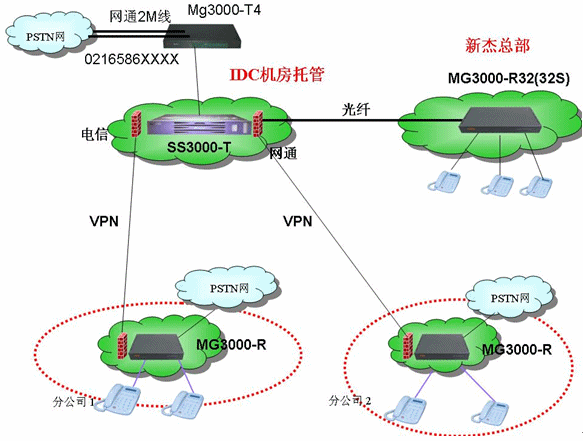- 各地全部采用MG3000-R,通過(guò)VPN注冊(cè)到軟交換平臺(tái)上,S口接普通電話,O口接原來(lái)的模擬線,整個(gè)系統(tǒng)通過(guò)各地-R的O口實(shí)現(xiàn)長(zhǎng)途落地的功能。