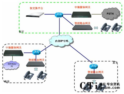 通過上述三環(huán)節(jié),即在財(cái)政內(nèi)部網(wǎng)上建立了一套跨區(qū)域的電話系統(tǒng)。拓?fù)涫疽鈭D如下:
