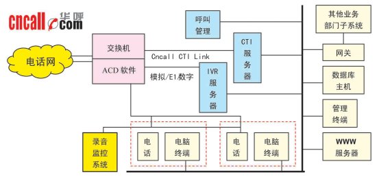 華呼(www.cncall.com)典型的基于交換機平臺廣電呼叫中心解決方案的主系統(tǒng)包括:PBX交換機平臺、計算機電話集成系統(tǒng)(CTI)、交互式語音應(yīng)答系統(tǒng)(IVR/IFR)、人工座席系統(tǒng)、電話錄音監(jiān)聽管理系統(tǒng)CCLog、呼叫中心管理系統(tǒng)CCM、數(shù)據(jù)庫應(yīng)用系統(tǒng)、WWW服務(wù)器、應(yīng)用網(wǎng)關(guān)。