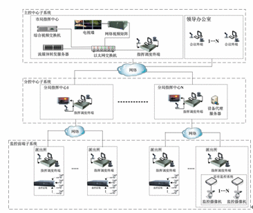 系統(tǒng)采用基于網(wǎng)絡(luò)的分布式控制結(jié)構(gòu),通過公安專網(wǎng)連接市局、縣/區(qū)分局、派出所三級單位,分為主控中心子系統(tǒng)、分控中心子系統(tǒng)、監(jiān)控前端子系統(tǒng)。結(jié)構(gòu)如下圖: