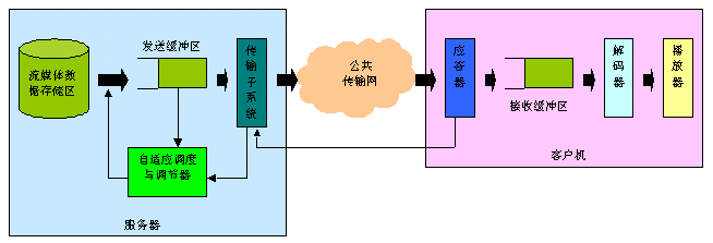 實時自適應網(wǎng)絡帶寬的流媒體傳送技術,是上海清鶴數(shù)碼科技公司的一項可大幅提高流媒體寬帶傳送過程中的關鍵服務質(zhì)量瓶頸的國際技術專利。我們知道,目前制約流媒體寬帶應用發(fā)展的核心問題在于服務質(zhì)量。簡單地說,由于因特網(wǎng)的狀況是不可靠的,其帶寬、負荷等變化劇烈,這難以滿足流媒體寬帶業(yè)務的實時性服務質(zhì)量要求,并常常造成播放卡殼、延遲、視頻質(zhì)量抖動劇烈等不良情況,給使用者感官造成很大影響。所以解決好流媒體寬帶應用的服務質(zhì)量問題對于流媒體寬帶應用是極為重要的。如圖1所示,在一般的流媒體寬帶系統(tǒng)里,視頻服務器通過網(wǎng)絡向客戶機實時傳送流媒體信息。