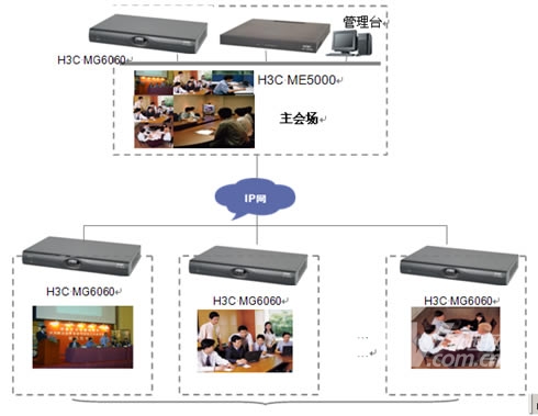 在主會場,分會場的會議室配備H3C高清視訊終端MG6060。H3C MG6060終端支持H.263、H.264等視頻編解碼協(xié)議,并采用了專有的視頻前、后處理技術,使得圖像質量大大提升,在周圍環(huán)境光照較差或者會場顏色搭配不甚和諧的情況下,仍舊能夠得到清晰、自然的圖像。視頻功能主要特色功能包括動態(tài)4CIF高清圖像、H.239雙視頻流傳送、畫中畫(PIP)、雙屏顯示、分屏顯示、VGA輸入、VGA輸出、桌面?zhèn)魉汀D像屏蔽、圖像參數調整等。有關H3C